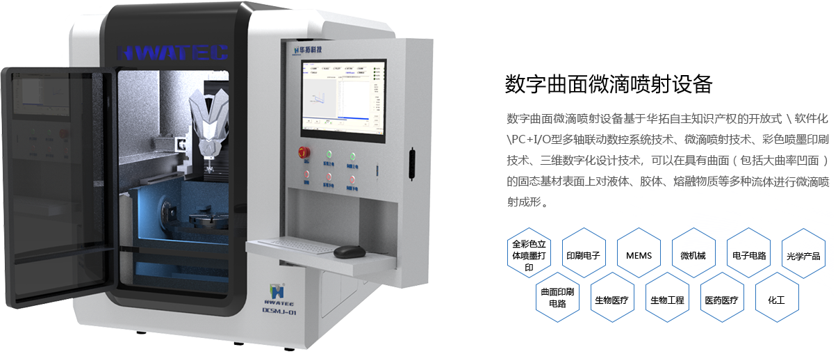 华拓科技自主研发的数字曲面微滴喷射设备可以实现在曲面形状(包括大曲率凹面)的底层上对液体、胶体、融溶物质等多种流体进行微滴喷射表面打印的专用设备。本产品在彩色立体喷墨打印、印刷电子、微机械、光电子、生物医疗和化工等领域具有广阔的应用前景。